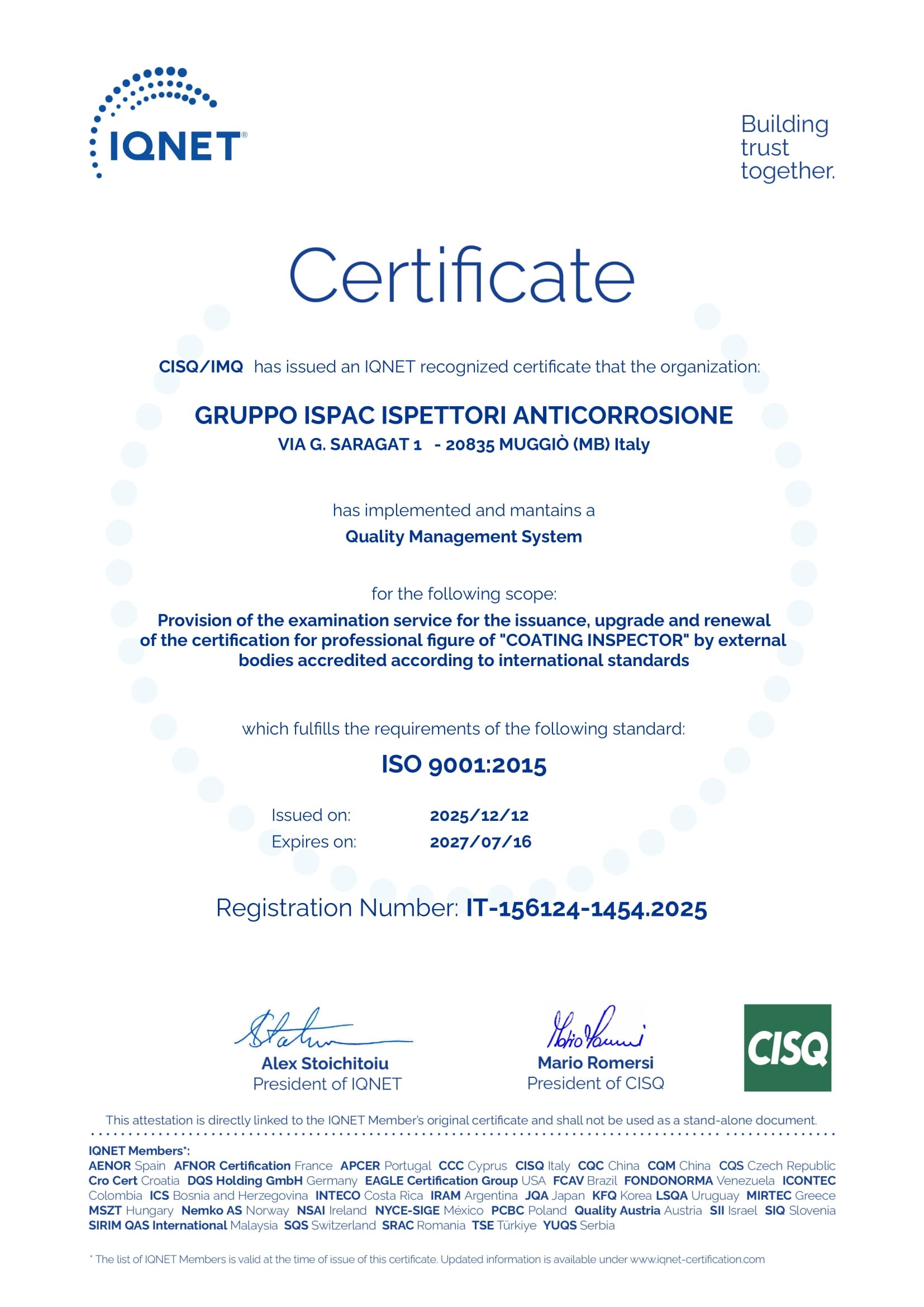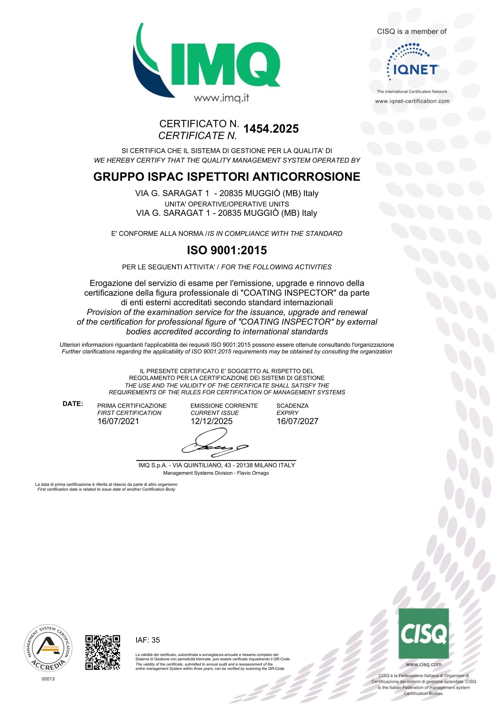 CERTIFICATE IMQ n° 1454.2025 - (CISQ-IQNET-ACCREDIA)